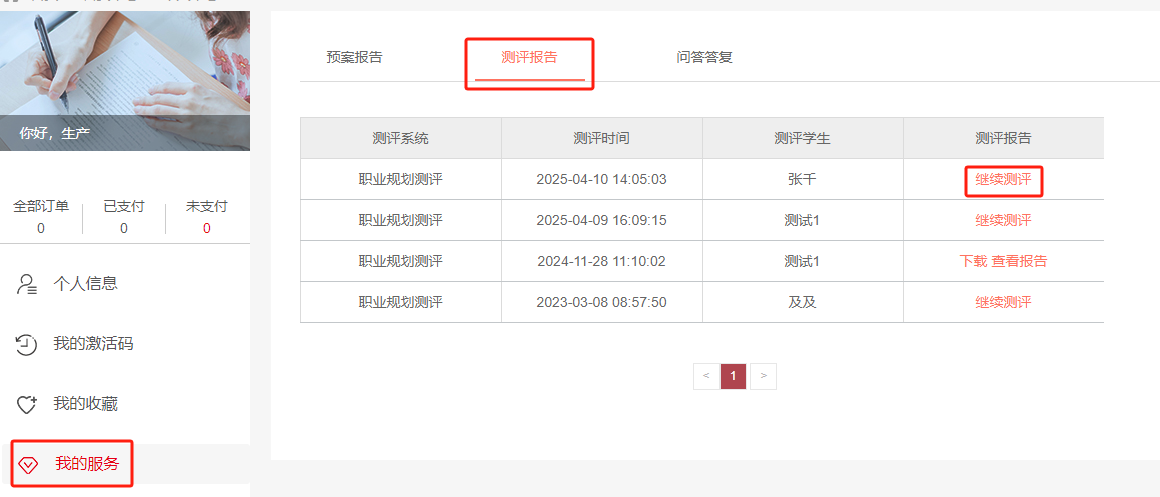 5.如果测评题目没有一次性做完,中途停止或退出,下一次想继续完成测评题目时,可在首页点击“个人中心”—“我的服务”—“测评报告”继续完成测评题目,用户也可在此查看、下载测评报告。