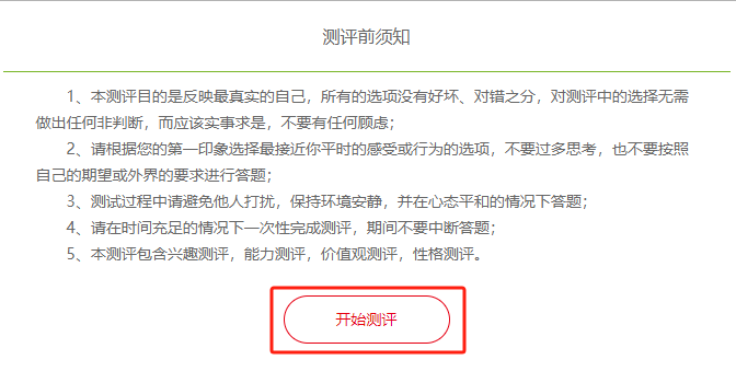 1.登录官方网站,点击网站首页菜单中“职业测评”—“进入测试”—“开始测评”。
