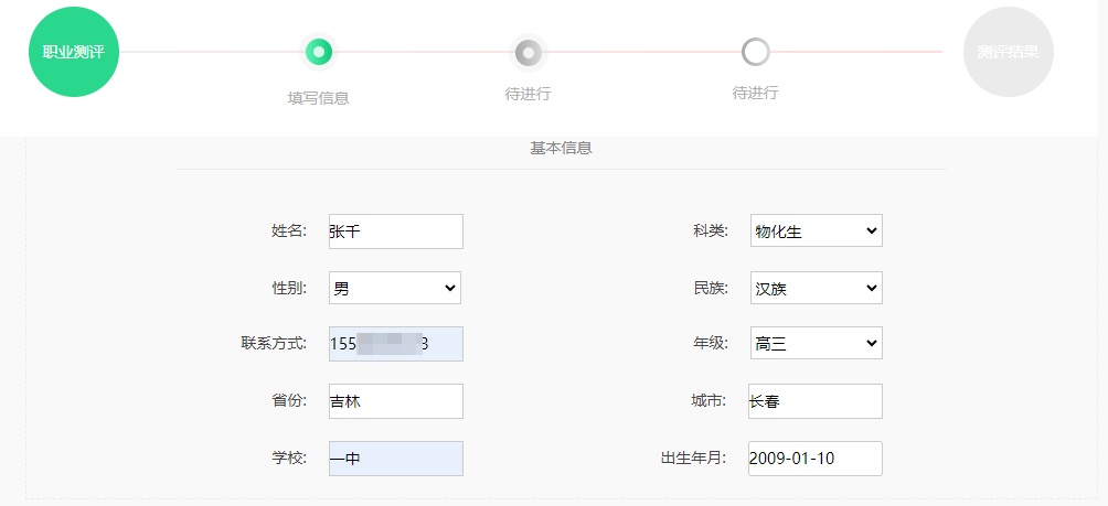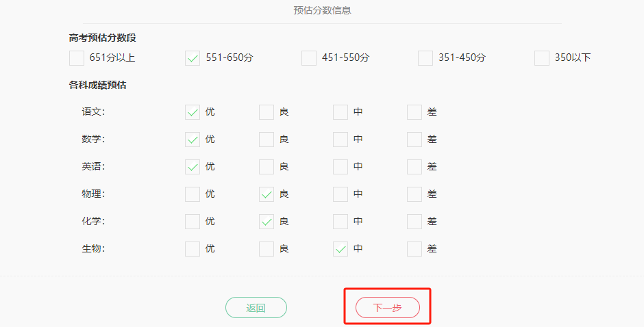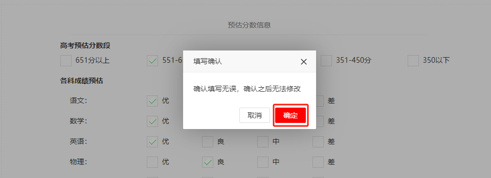 2.跳转后,进入信息填写页面。根据学生的实际情况填写“基本信息”和“预估分数信息”;然后点击“下一步”-“确定”。
