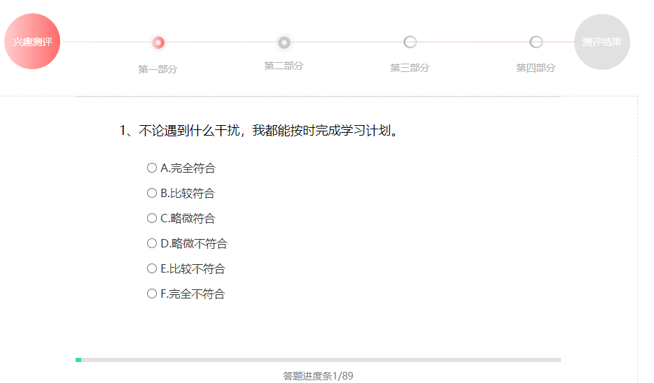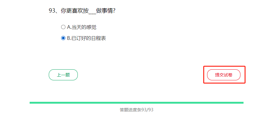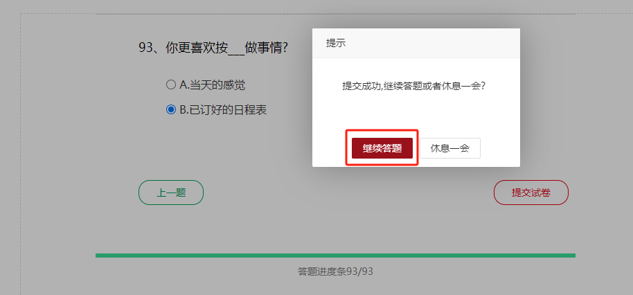 3.开始答题,试题共有四个部分,每部分题目完成以后,均会出现“提交试卷”按钮,点击“提交试卷”-“继续测评”即可;