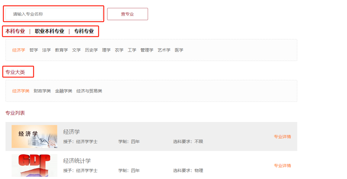 2.可在搜索栏中,输入专业名称,点击“查专业”,即可查看所查专业详情;还可以根据学科门类和专业大类进行查询。