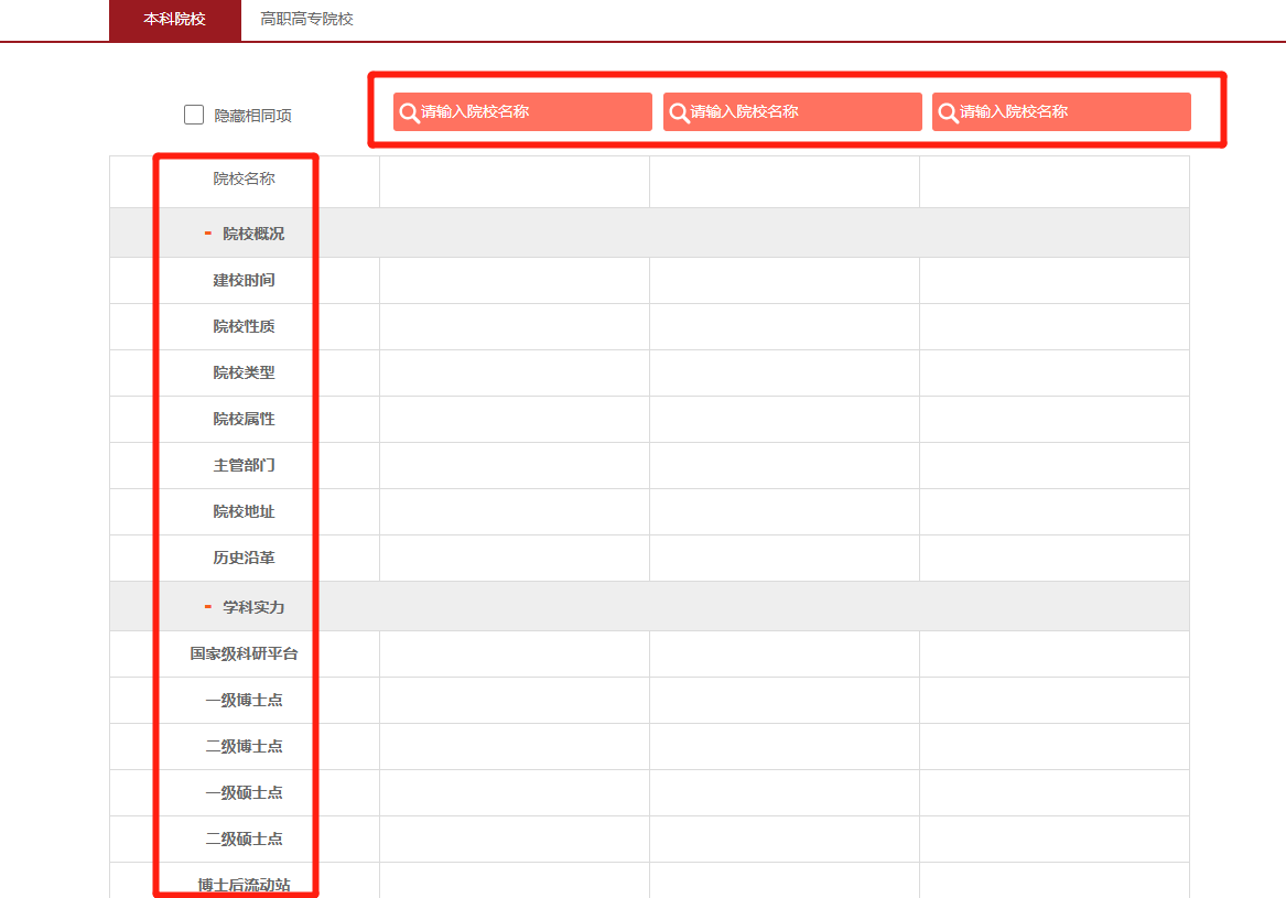 2.输入要对比院校的名称,院校对比功能可同时实现三所院校对比,对比内容包括院校概况、学科实力、优势专业、师资力量四个维度。