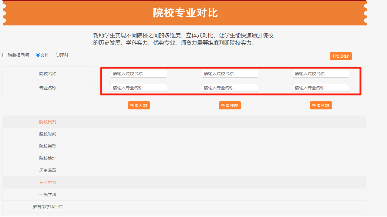 2.输入要对比的院校名称及专业名称。