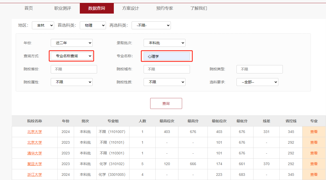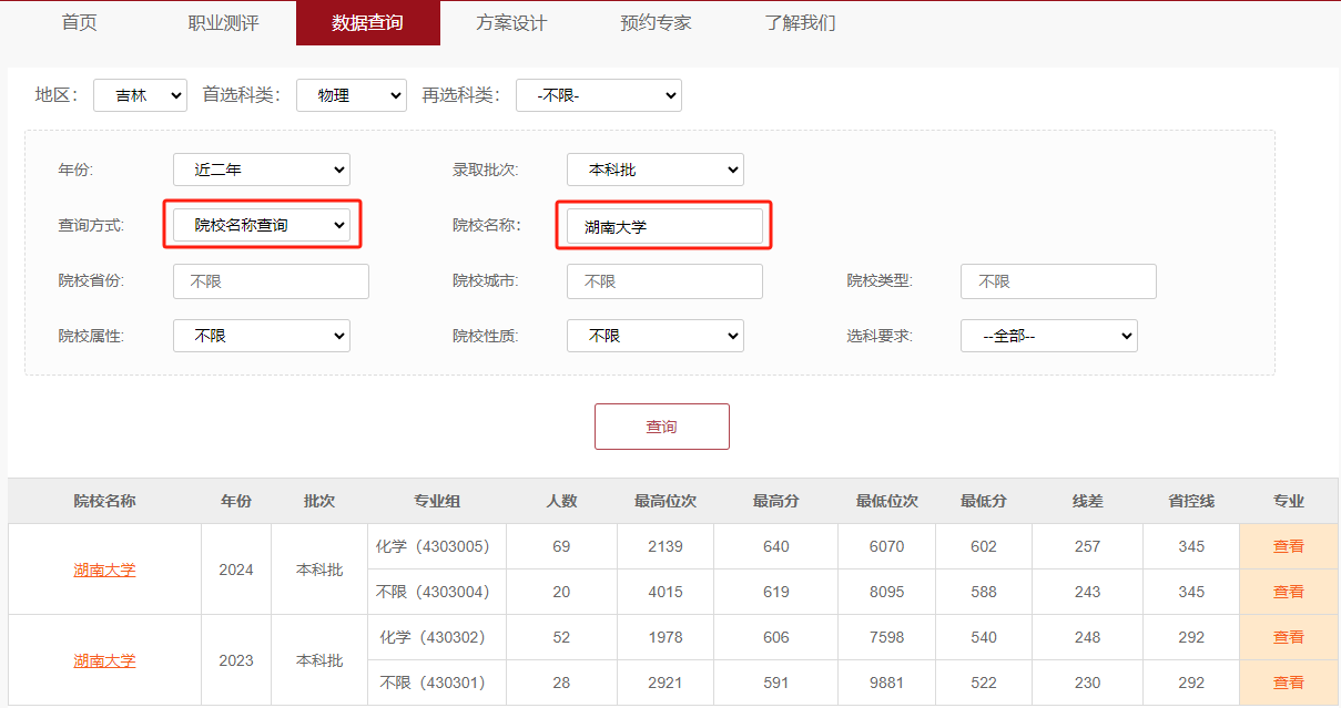 2. 根据需要选定各筛选条件,包括地区、科类、年份、录取批次、查询方式、院校省份等。其中,查询方式分为两种:院校名称查询、专业名称查询。