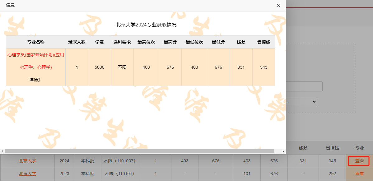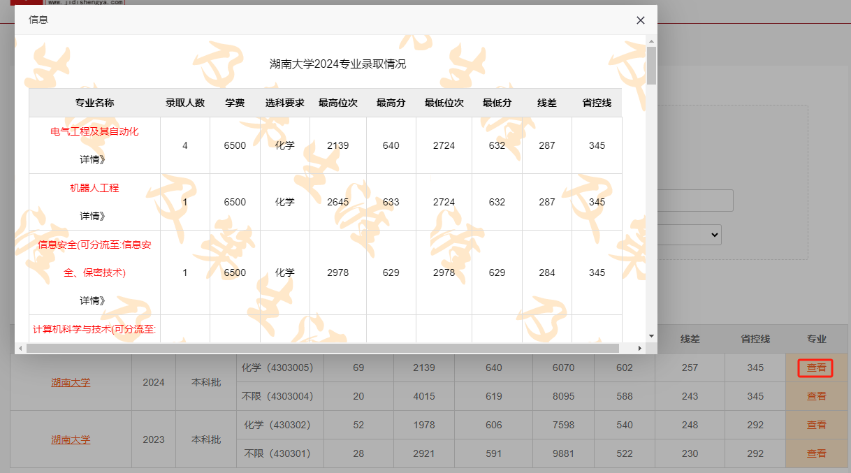 ②点击“查看”,可查看到该院校在某一年份的专业录取情况。