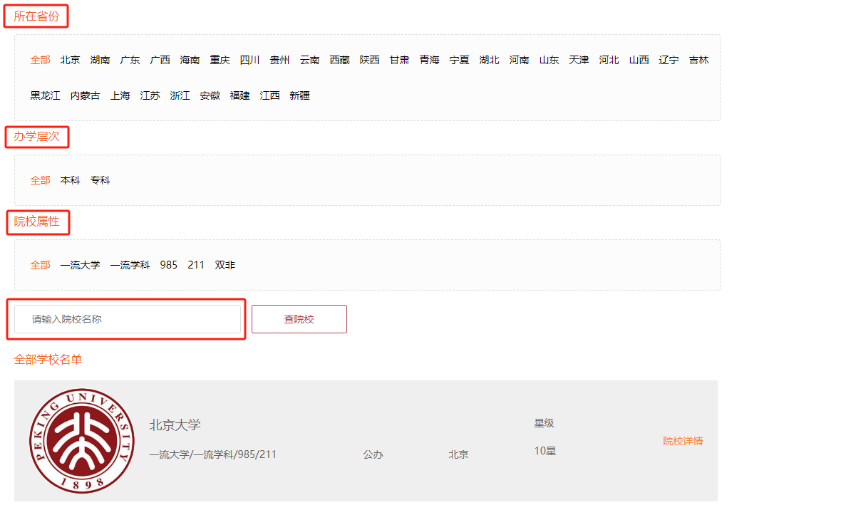 2.可根据筛选条件(所在省份、办学层次、院校属性)批量筛选院校;也可以直接在搜索栏中直接输入院校名称,单独查询到一所学校。
