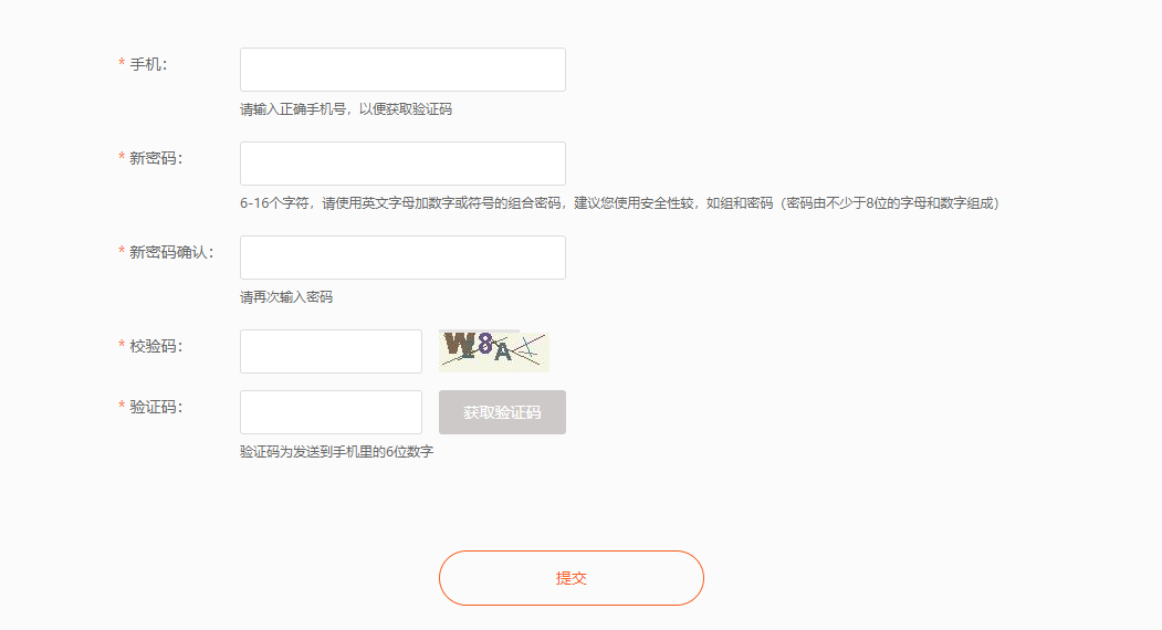 2.填写注册时使用的手机号,输入新密码和验证码,点击“提交”,再次用新密码登录即可。